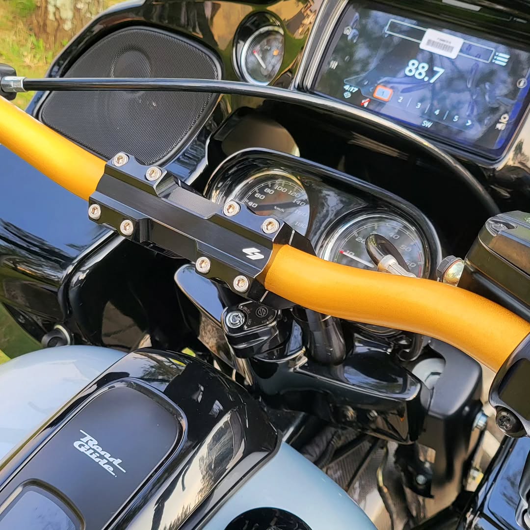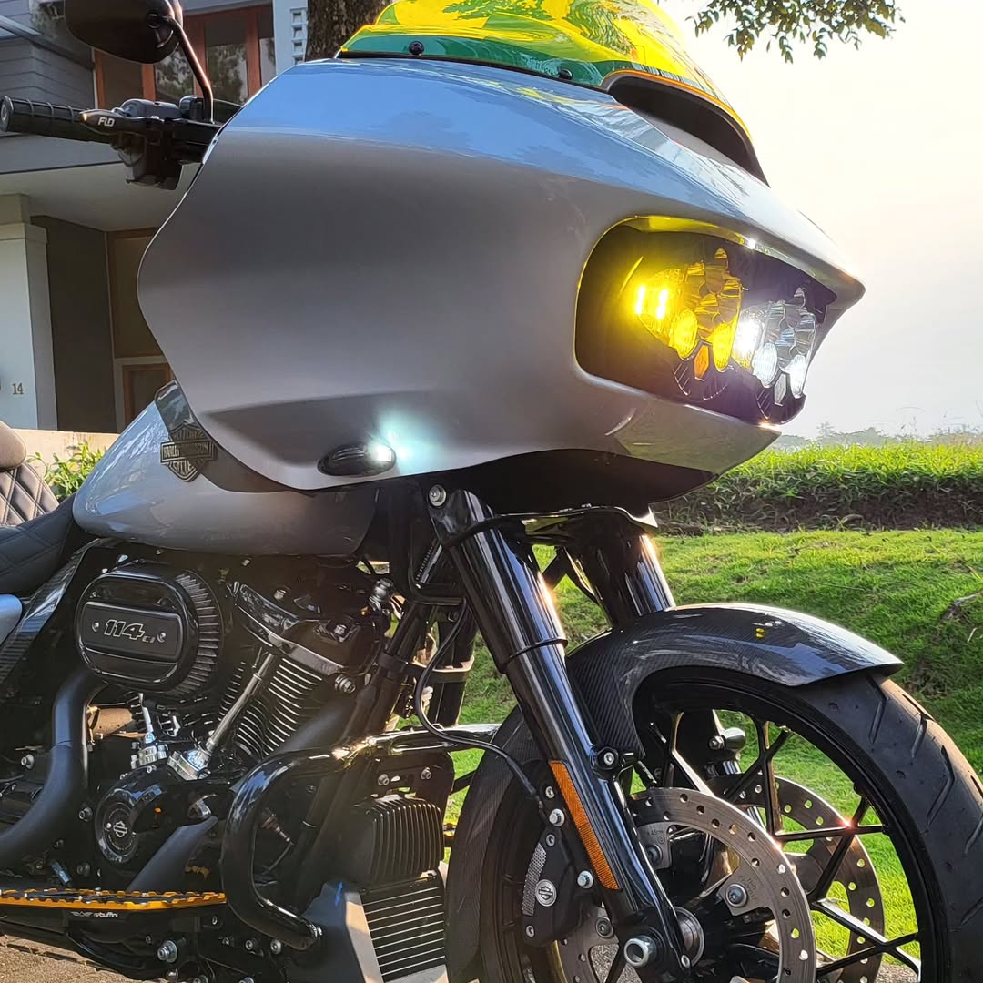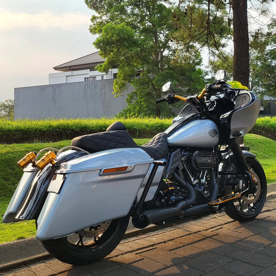 The bike is designed with ergonomics in mind, featuring wide handlebars for better leverage, spacious floorboards for foot positioning, and a comfortable seat that supports long rides. The Road Glide Special also boasts a distinctive shark-nose fairing that houses the advanced Boom! Box GTS infotainment system, enhancing the riding experience with modern technology.