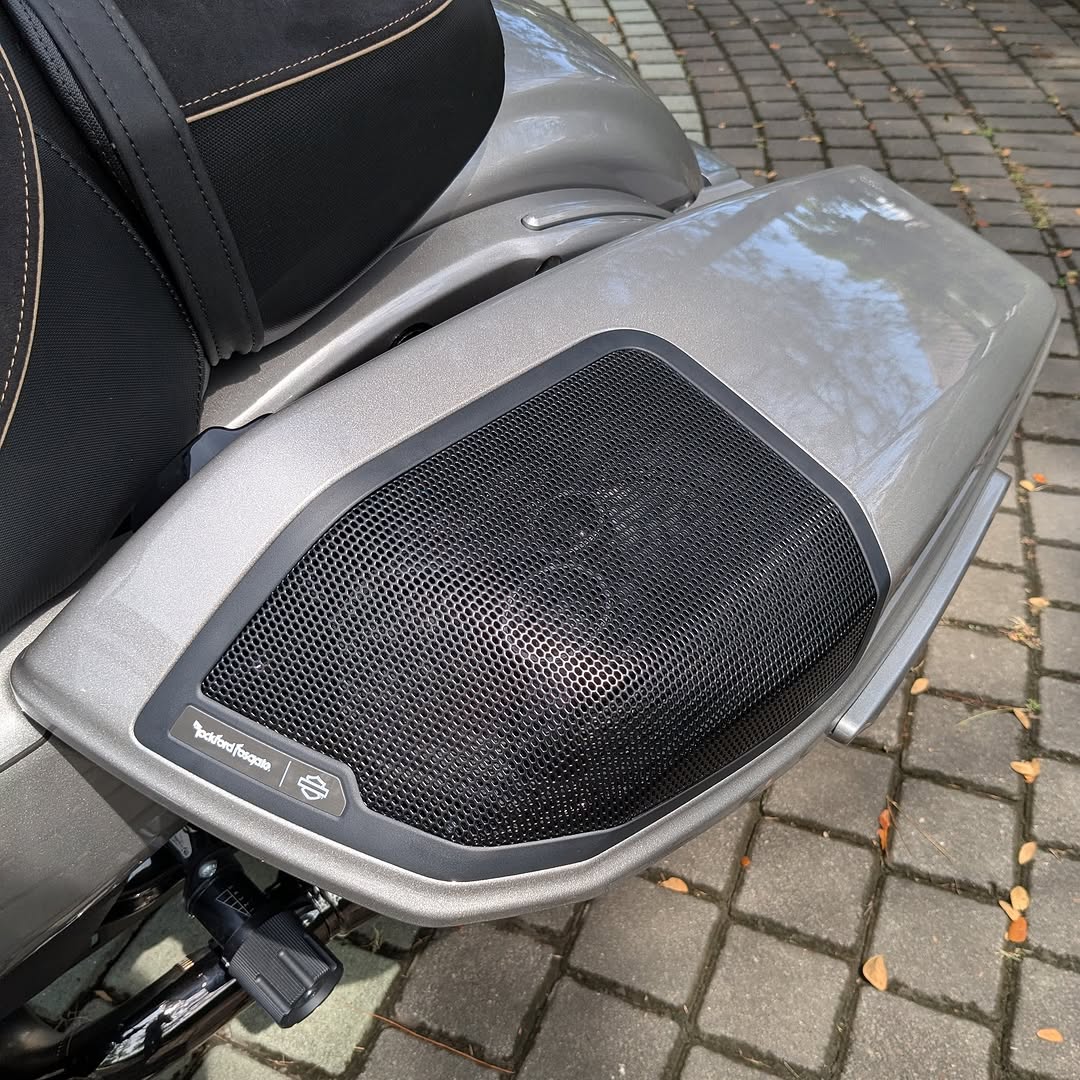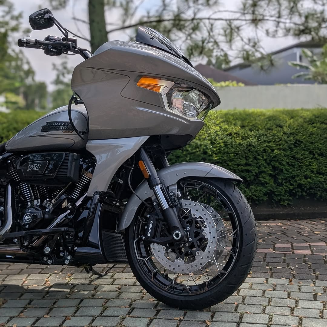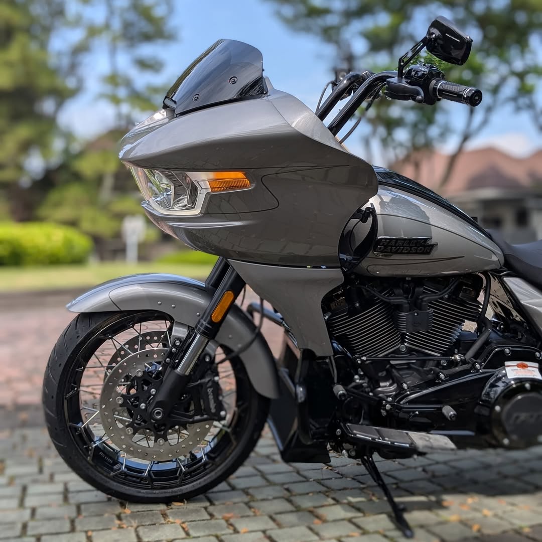 This motorcycle is equipped with a High Output (H.O.) version of the Milwaukee-Eight engine, which has an increased rev limit of 5900 rpm. The engine’s design takes inspiration from the Screamin’ Eagle Factory Team Road Glides used in competitive racing, specifically in the King of the Baggers championship.