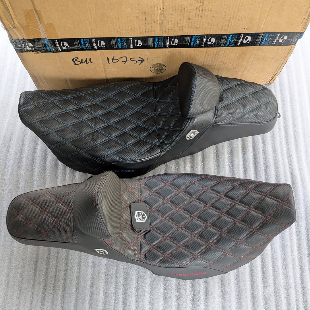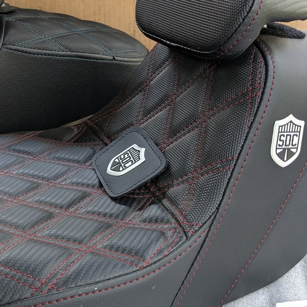 The Saddlemen Pro SDC Seat in Black Wine Berry Stitch is designed specifically for Harley Davidson motorcycles, offering a blend of style and comfort. This seat features a unique color combination that enhances the aesthetic appeal of the bike while providing a comfortable riding experience. The seat is constructed with high-quality materials, including SaddleHyde for durability and weather resistance, and incorporates GelCore™ technology, which significantly reduces vibrations and road impacts.