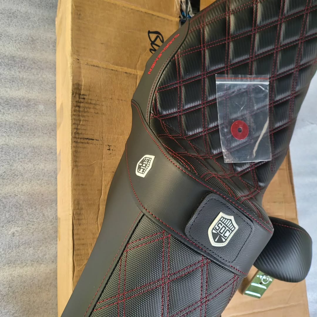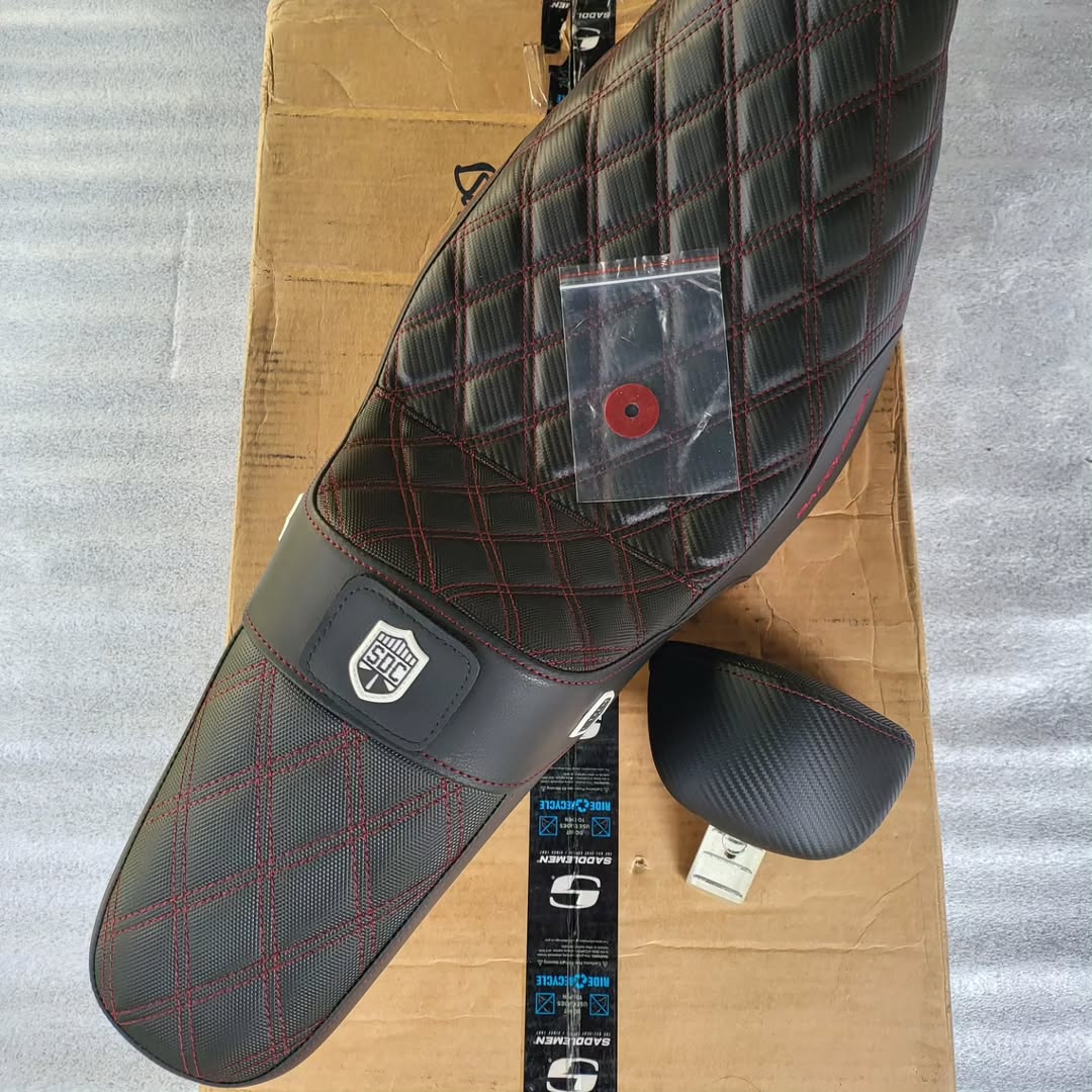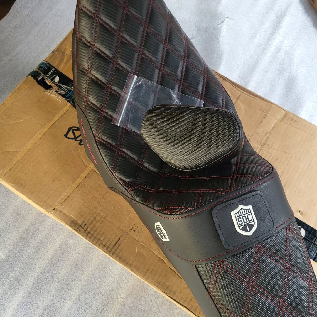 The Saddlemen Pro Series SDC Performance Seat in Black Wine Berry Stitch is designed specifically for Harley-Davidson motorcycles, providing both style and comfort. This seat features a unique color combination that enhances the aesthetic appeal of the bike while maintaining a sporty look. The seat is constructed with high-quality materials, including SaddleHyde for durability and weather resistance, and incorporates GelCore™ technology, which significantly reduces vibration and road impacts.